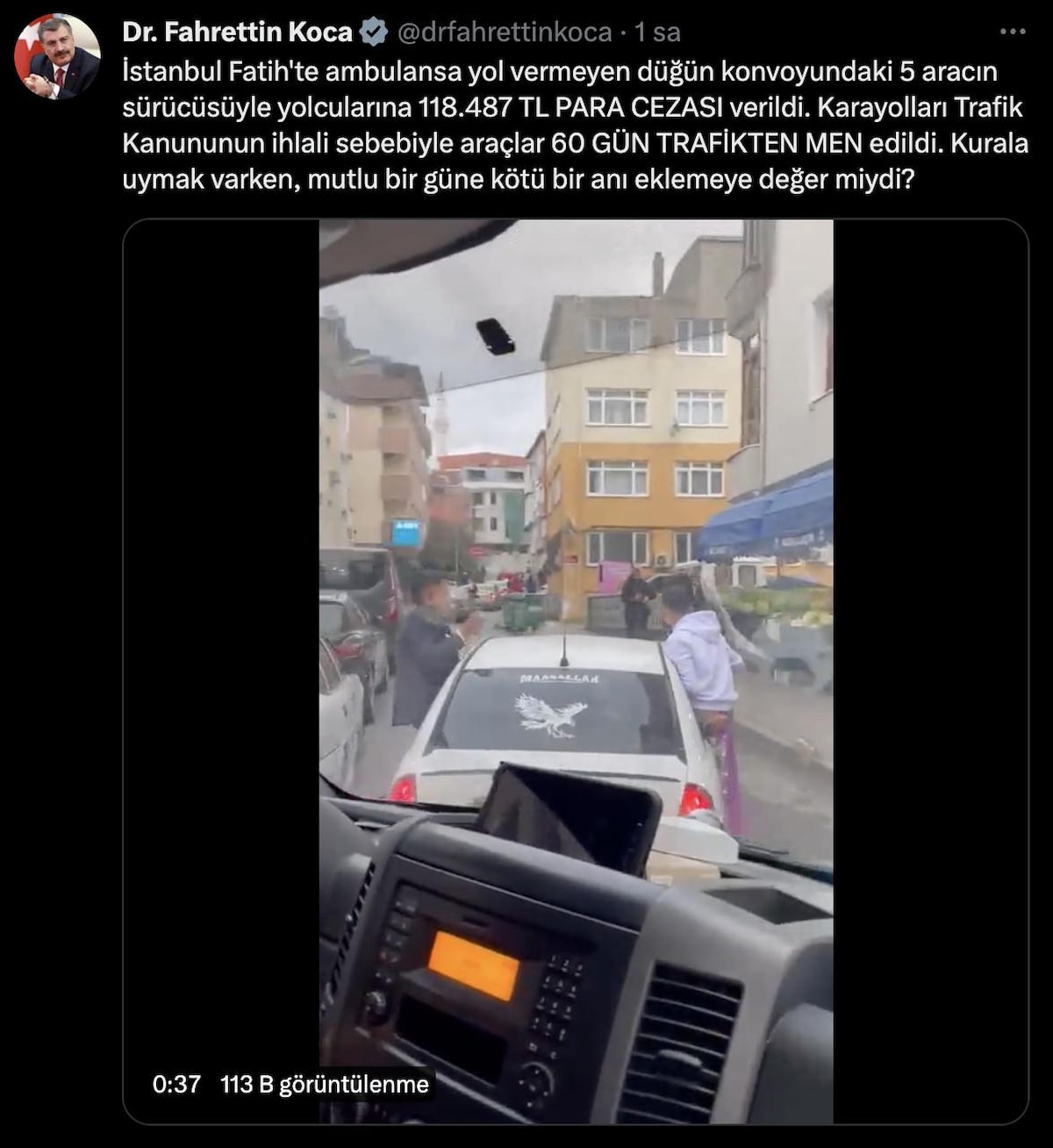 Konuya ilişkin açıklama yapan Sağlık Bakanı Fahrettin Koca, İstanbul Fatih’te ambulansa yol vermeyen düğün konvoyundaki 5 aracın sürücüsüyle yolcularına 118 bin 487 lira para cezası verildiğini bildirdi.