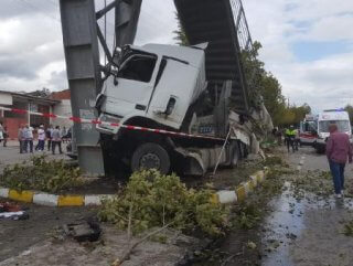 Tır, üst geçidin ayağına çarparak çarparak durdu. Kazayı görenler hemen yardıma koştu ve 112 Acil'e haber verdi.