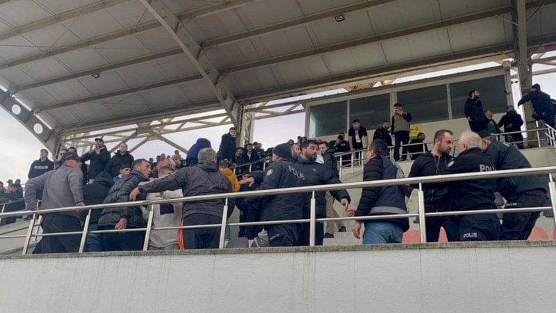 Karşılıklı küfürleşmenin ardından tribünlerde sandalye, taş parçaları ve su şişeleri atıldı.