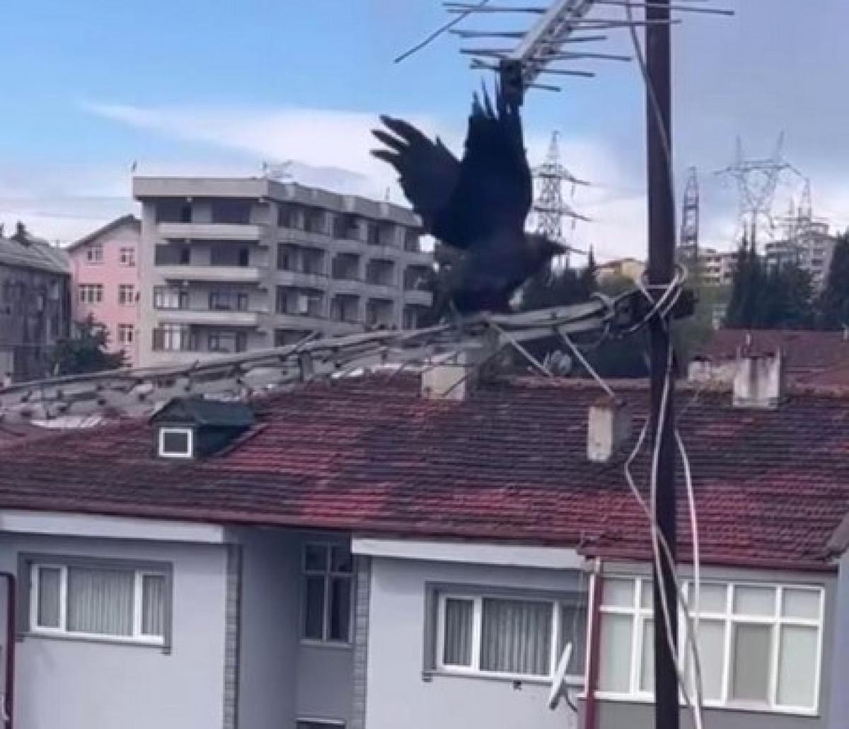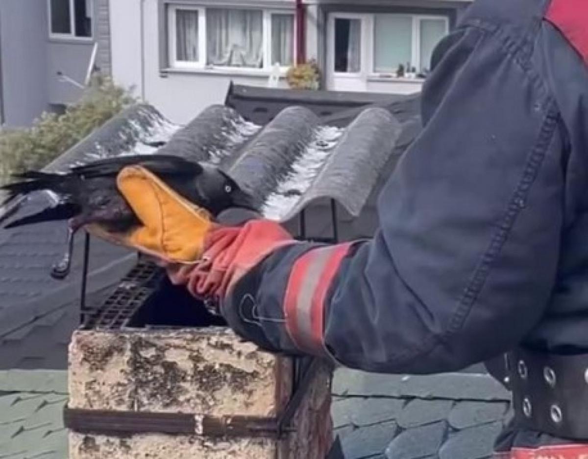 Merdivenli araçla çatıya çıkan itfaiye erleri, antene sıkışan kargayı bulunduğu yerden kurtardı. Serbest kalan karga, uçarak bölgeden uzaklaştı. O anlar sosyal medya hesabından paylaşıldı.