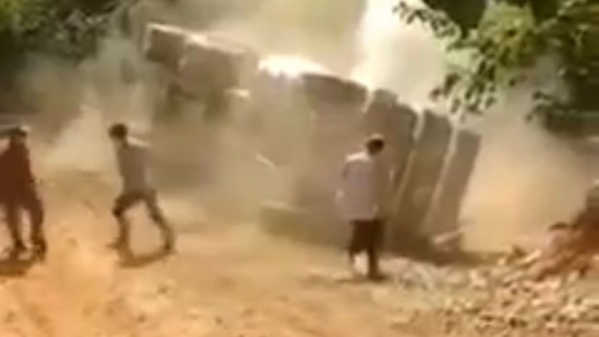 Beton mikserinin devrilme anı, cep telefonu kamerasıyla görüntülendi. Kazada yaralanan olmadı.