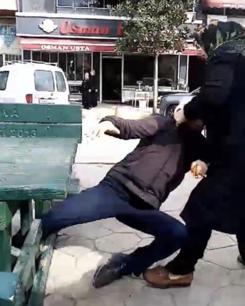İlçe merkezinde bulunan parkın ortasında adama tokat atarak evire çevire dövdü.