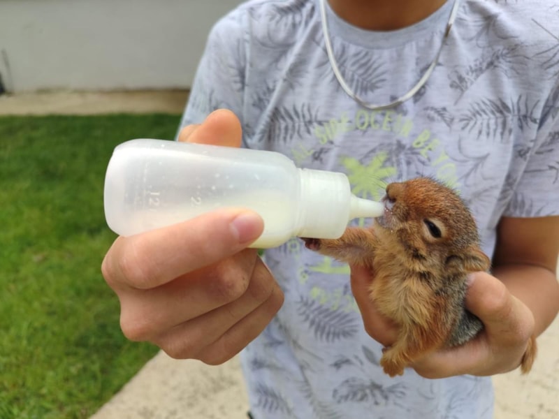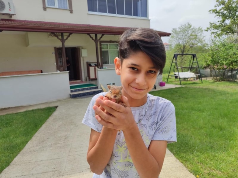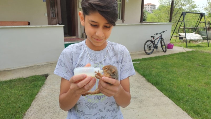 Sakarya'nın Akyazı ilçesine bağlı Kuzuluk Orta Mahalle'de ikamet eden 13 yaşındaki Hasan Seyfi Çelik, ailesiye birlikte gittiği mezarlık ziyaretinde bir ağacın altında yeni doğmuş sincap yavrusu buldu.