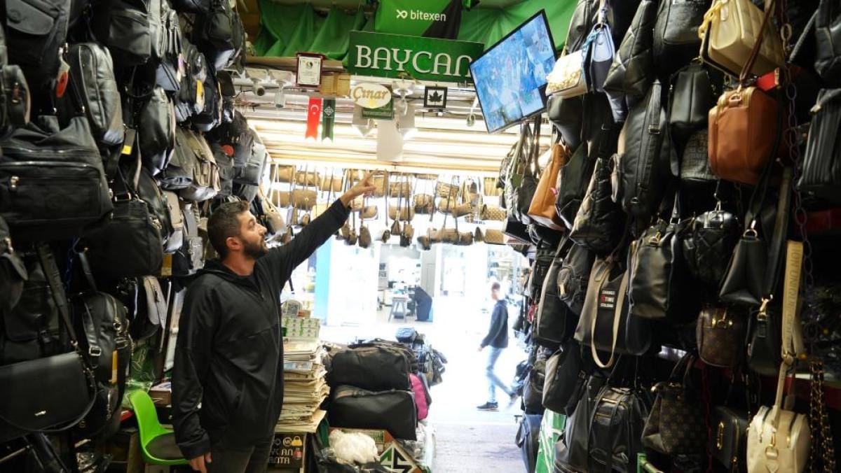 Bir çanta dükkanına gelen yaşlı kadın, dükkanın önünde yer alan sepetteki çantalara yöneldi.