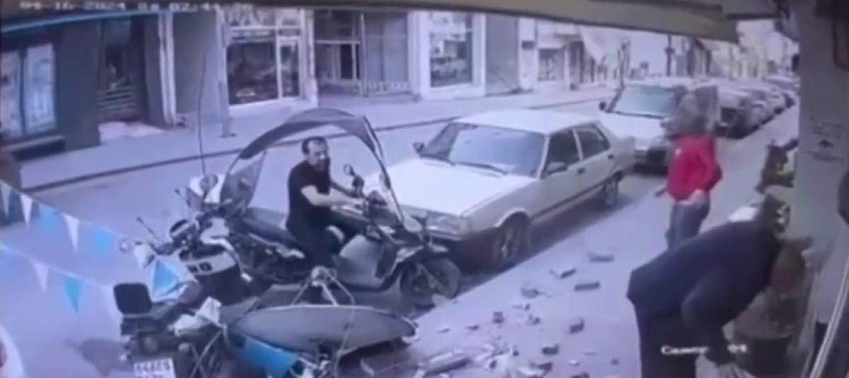 Kırılan tenteden ve duvardan kopan parçaların yayaya isabet ettiği anlar bir iş yerinin güvenlik kamerasına saniye saniye yansıdı.