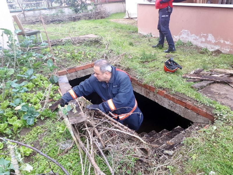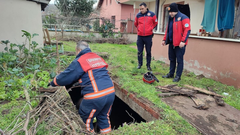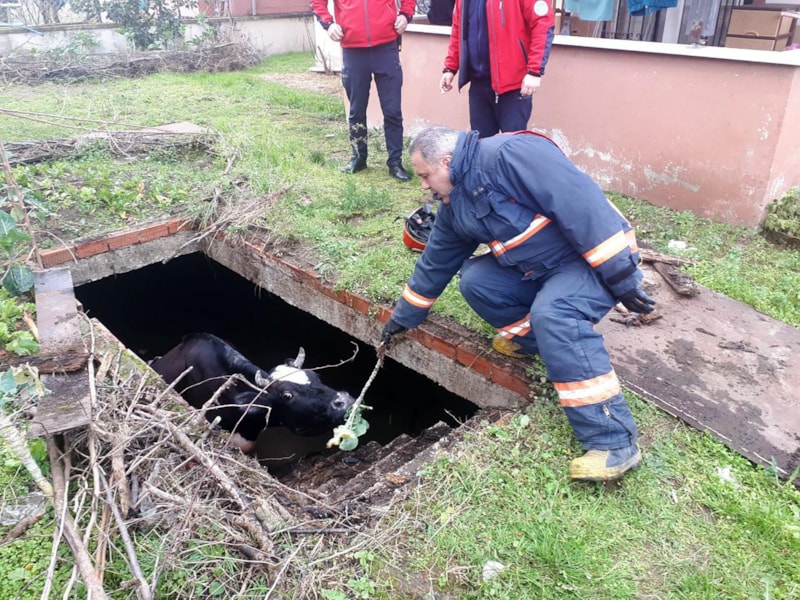 Karasu ilçesinde bulunan su dolu çukura düşen inek için ekipler harekete geçti. Ekipler, ineği ellerindeki lahanayı uzatarak çıkardı.