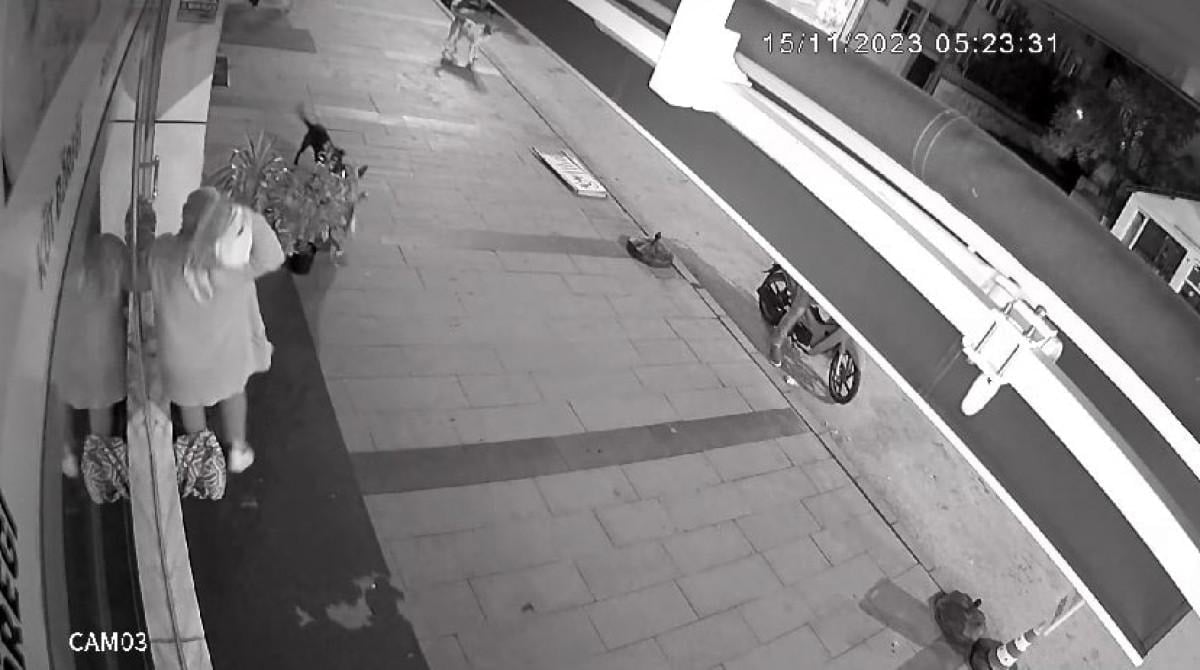 Görüntülerde; dükkan açmaya gelen kadına köpeklerin saldırması, bir vatandaşın kadına yardım etmesi yer alıyor.