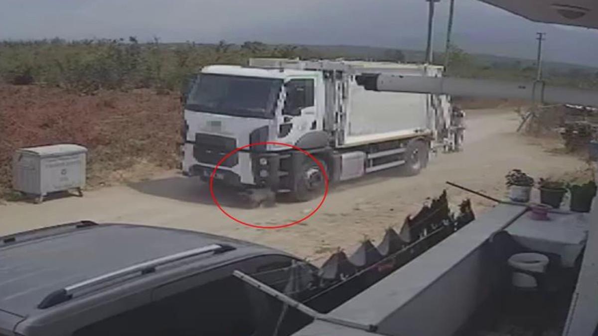 Sakarya'nın Karapürçek ilçesi Ahmet Mahallesi'nde belediyeye ait çöp kamyonu yola atlayan sahipsiz köpeklere çarptı.