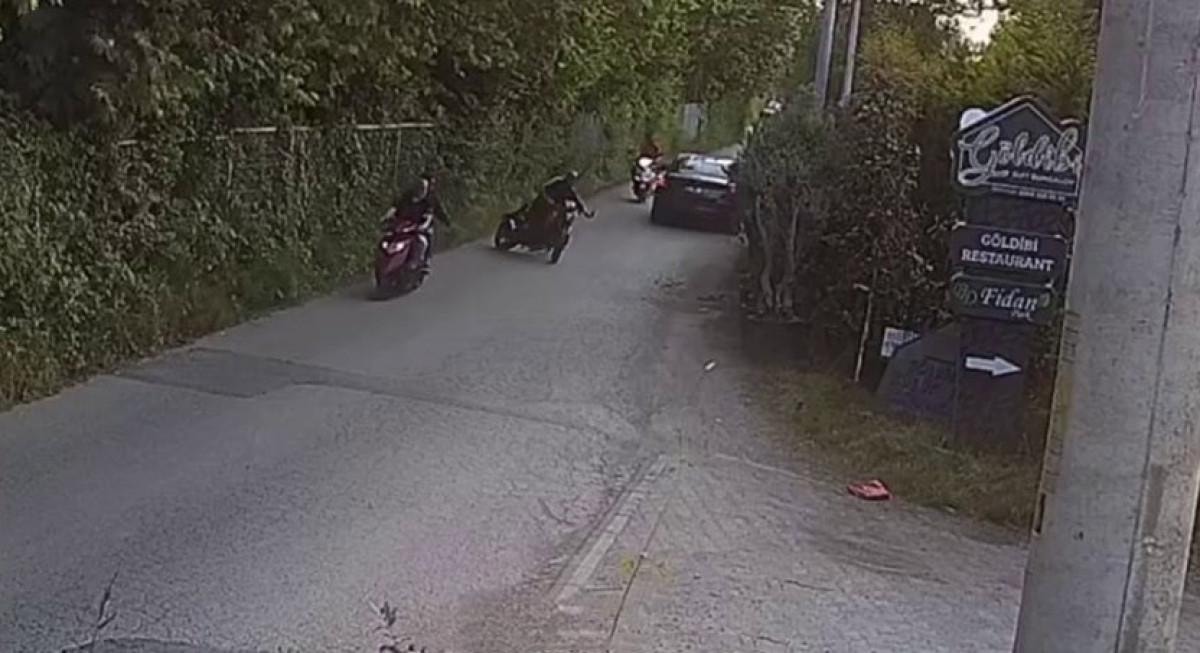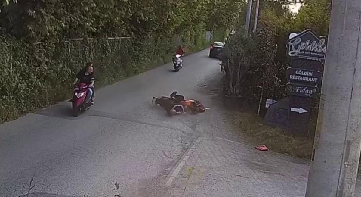 Görüntülerde, motosikletin savrularak devrilmesi ve kask takmadığı görülen sürücünün sert şekilde yere çarpması yer alıyor.