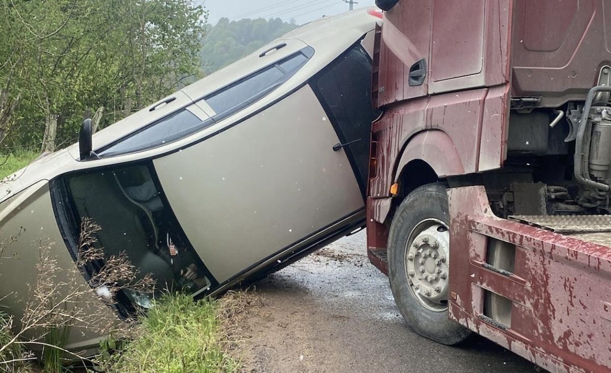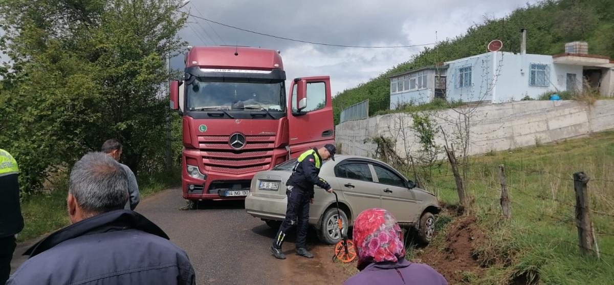 Sakarya'nın Karasu ilçesinde, Cengizhan Gündoğdu’nun kontrolünü yitirdiği otomobil, karşı yönden gelen tıra çarparak yol kenarındaki dereye yan yattı.