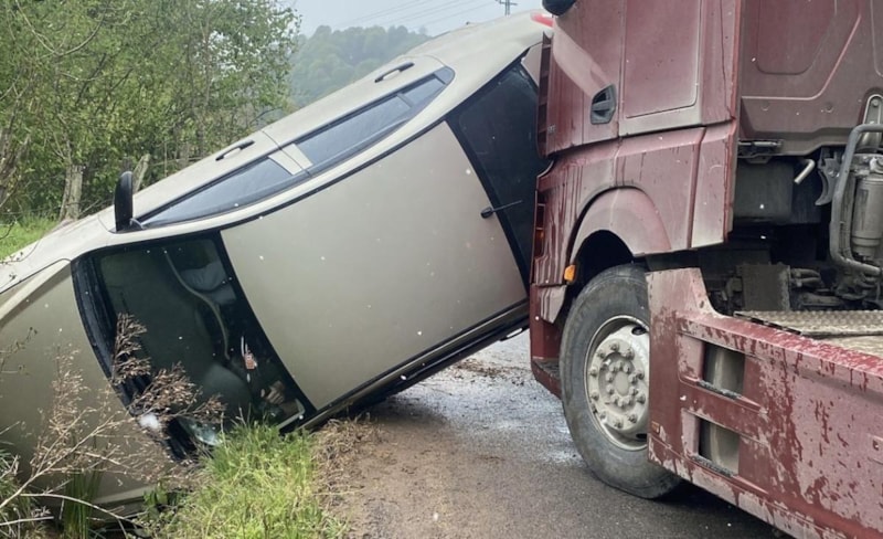 Karasu ilçesinde tıra çarpan otomobil dereye devrildi. Yan yatan otomobilde mahsur kalan sürücü ile yanındaki arkadaşı o anları, cep telefonu kamerasıyla kayda aldı.