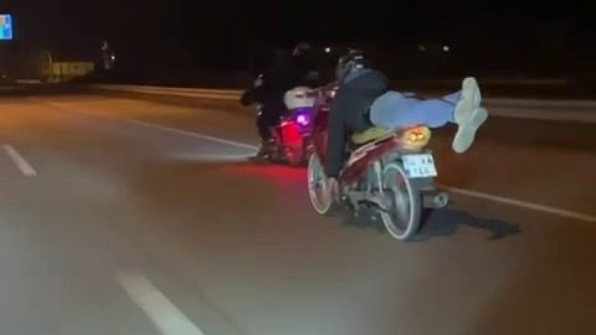 Görüntülerde, sürücünün yüzüstü yatarak kullandığı motosiklet ile tırı solladığı, daha sonrasında sağ şeride geçtiği ve motosikletine yatarak yolculuğuna devam ettiği görülüyor.