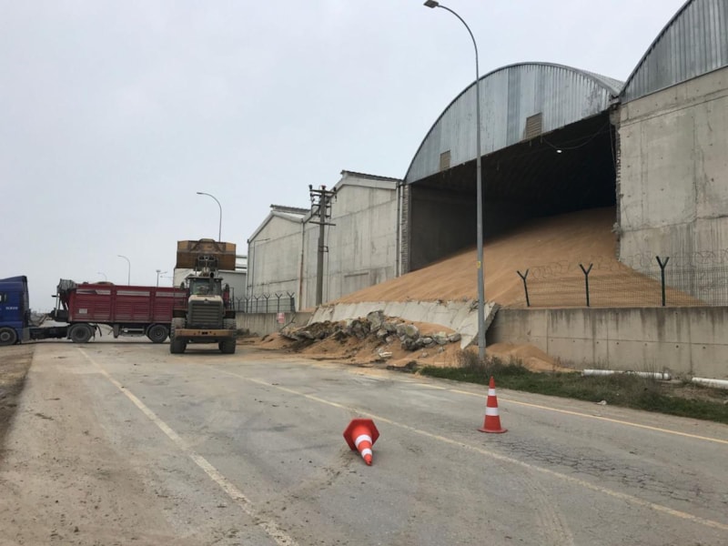 Tahılın depolandığı kısımda iddiaya göre aşırı dolumdan dolayı duvar, yol tarafına doğru yıkıldı.