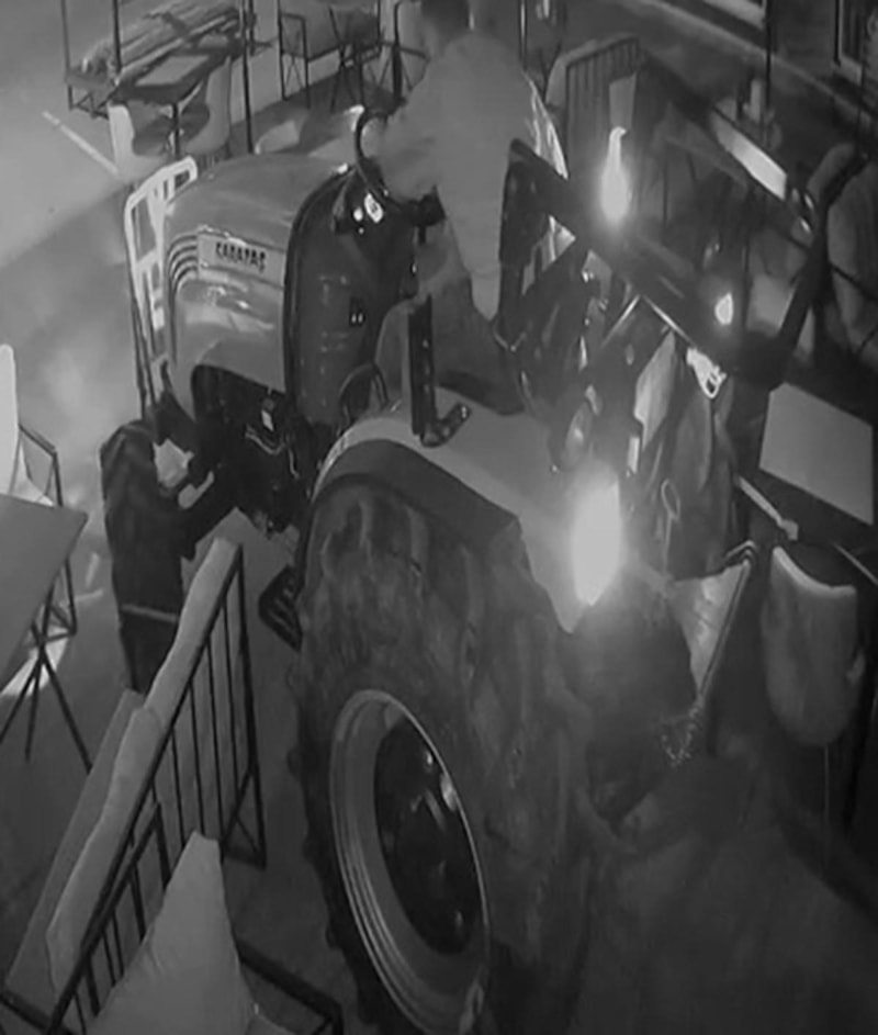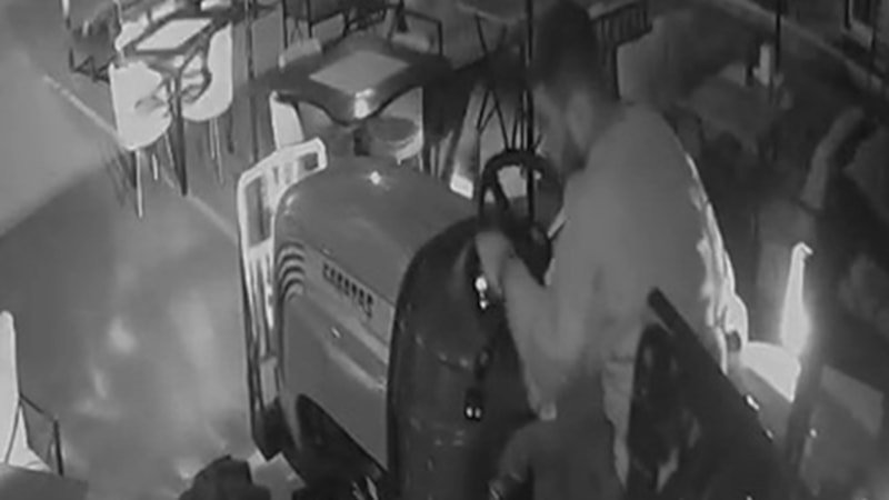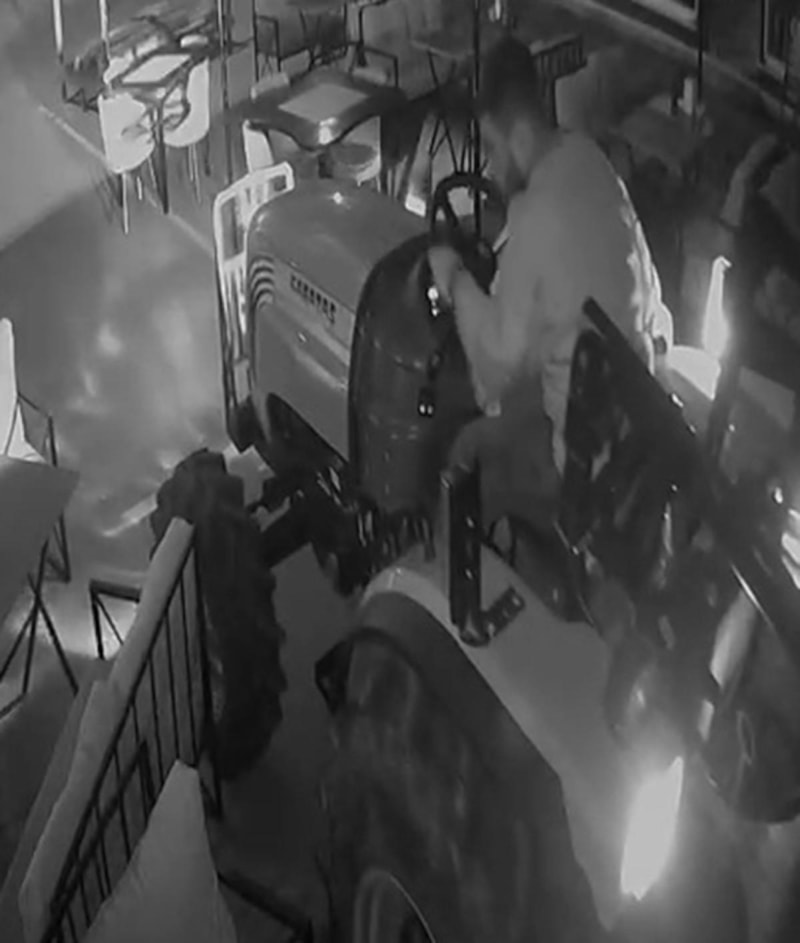 Görüntülerde traktör sürücüsünün masa ve sandalyeler arasında gezdiği anlar yer aldı.