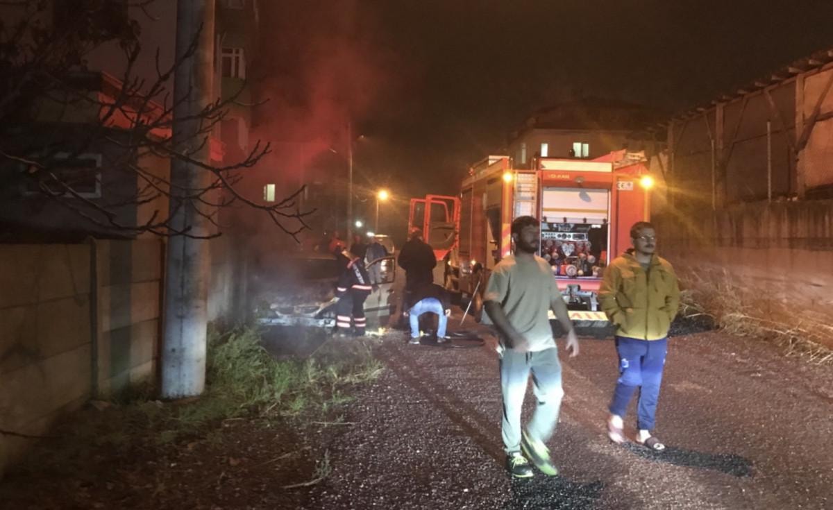Otomobildeki yangın söndürülürken, polis ekipleri olay yerinde inceleme yaptı.