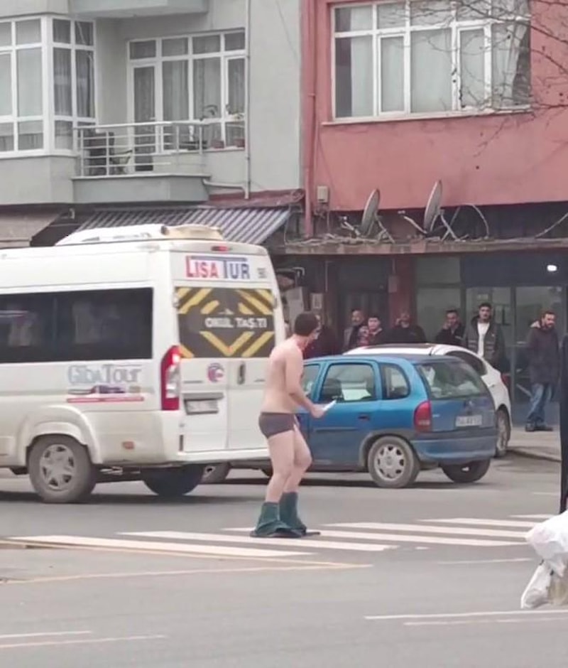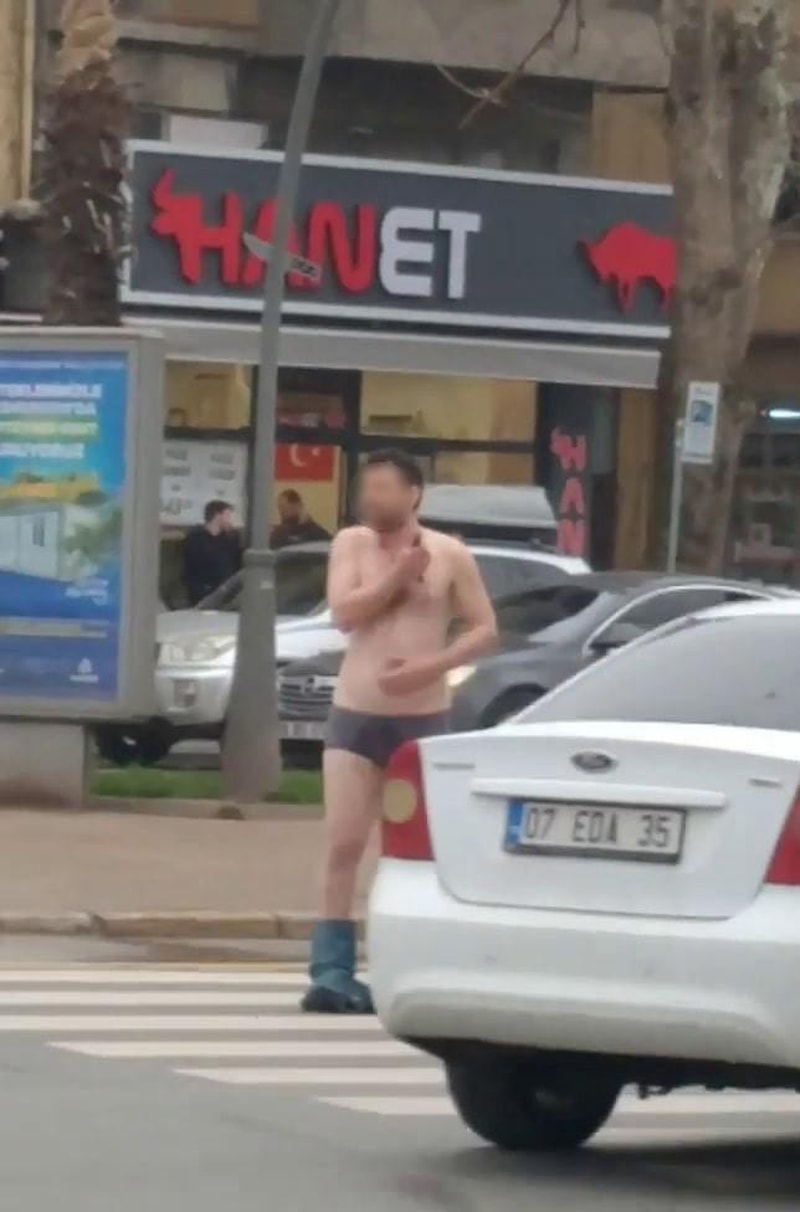 Görüntülerde, ismi öğrenilemeyen şahsın yarı çıplak şekilde cadde ortasında durması, elindeki bıçakla kendine zarar vermeye çalışması ve küfretmesi yer alıyor.