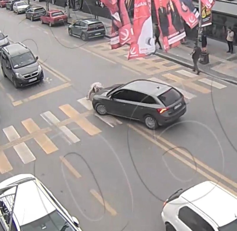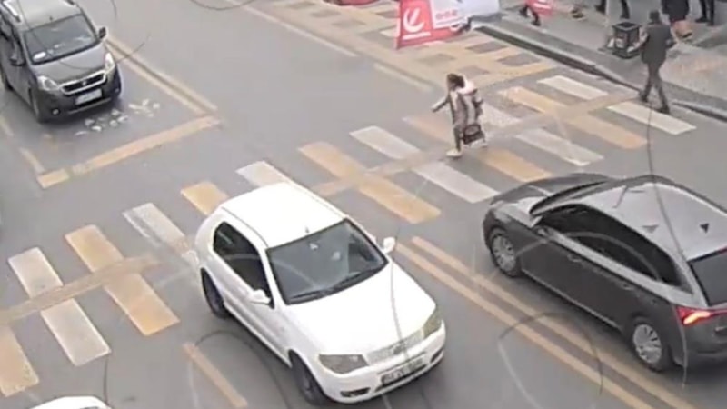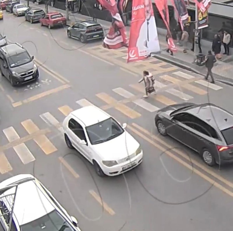 Yaya geçidinde yürüdüğü esnada yolun sağ tarafını kontrol eden küçük bir kız çocuğuna otomobilin çarpma anı görüntülendi.