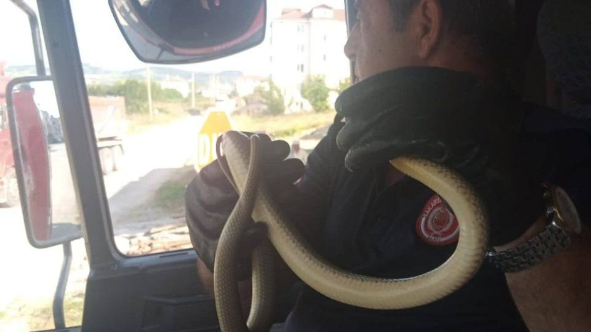 Konunun haber verilmesi üzerine bölgeye sevk edilen itfaiye ekipleri, evin kapı girişinde lastiklerin arasına giren yılanı bulunduğu yerden çıkarttı.