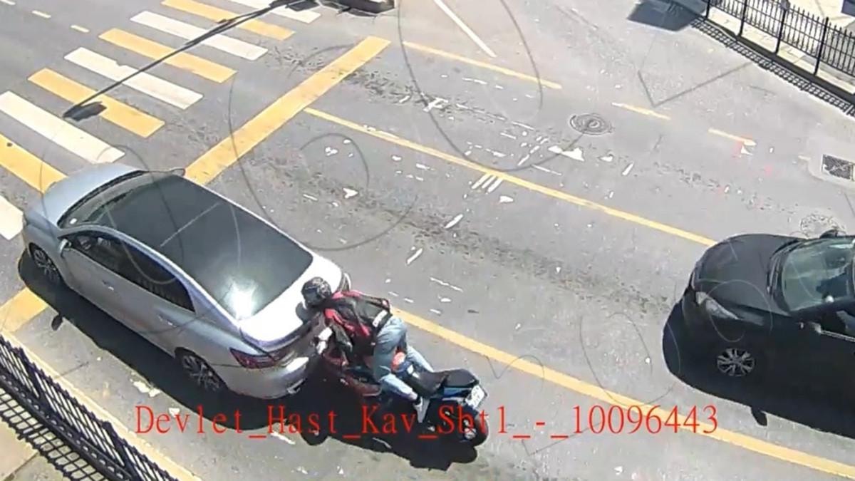 Başka bir görüntüde ise bir yaya, sürücüsünün kontrolünden çıkıp devrilen motosikletin kendisine çarpmasından son anda kurtuluyor.