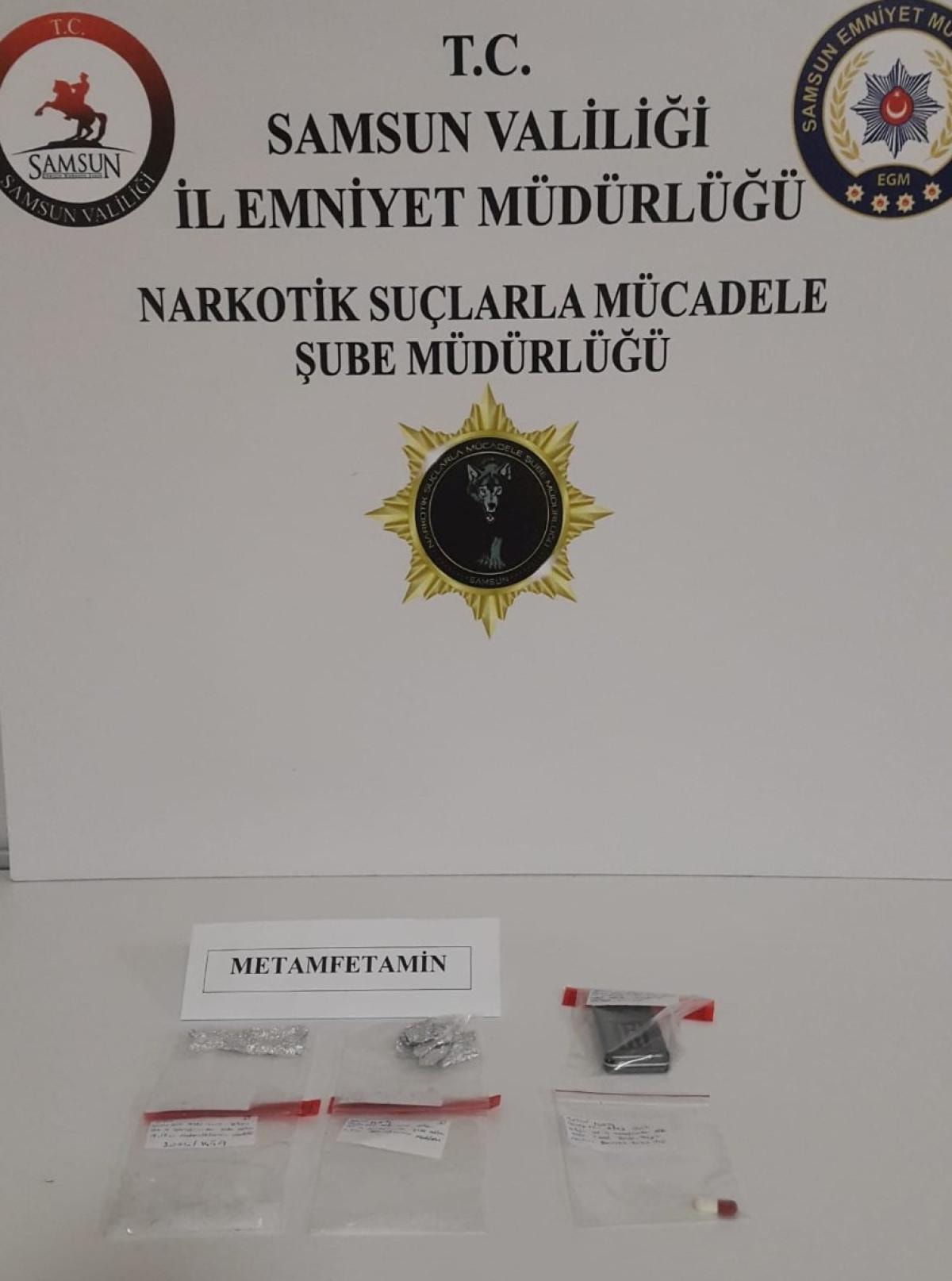 Ataş’ın kaldığı Atakum ilçesi Yenimahalle Mahallesi’ndeki otelde yapılan aramada 15,92 gram metamfetamin, 1 sentetik hap ve 1 hassas terazi ele geçirildi.