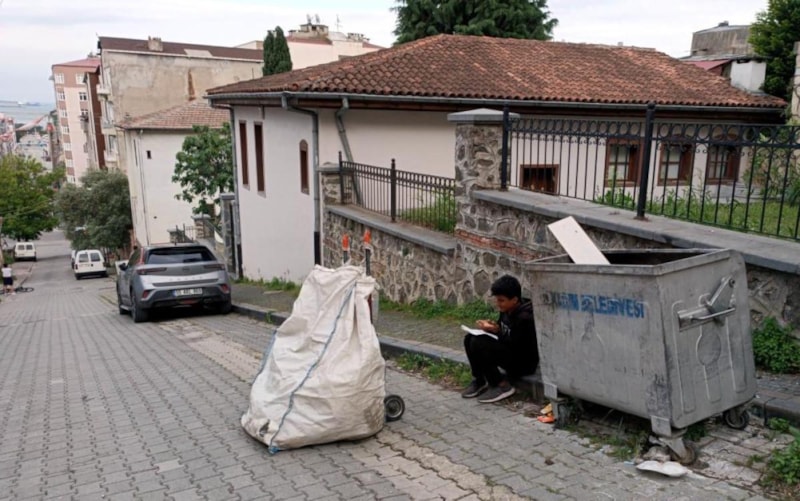 Samsun'un İlkadım ilçesi Pazar Mahallesi Çifte Hamam Caddesi üzerinde kağıt toplayan bir çocuk, mahalledeki geri dönüşüm maddelerini çöp konteynerinden topladıktan sonra kaldırıma oturup, defterini çıkartarak ders çalışmaya başladı.