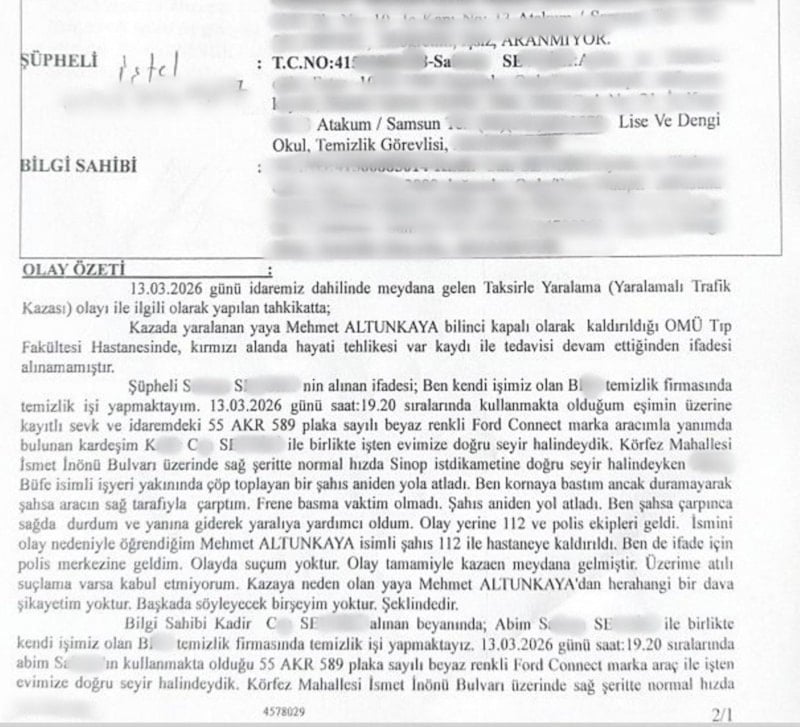 Kazaya karışan 27 yaşındaki kamyonet sürücüsü S.S., Atakum Polis Merkezi’nde verdiği ifadede, Altunkaya’nın aniden yola çıktığını, kornaya bastığını ancak duramayarak çarptığını belirtti. S.S., aracını durdurup Altunkaya’ya yardım ettiğini savundu.
