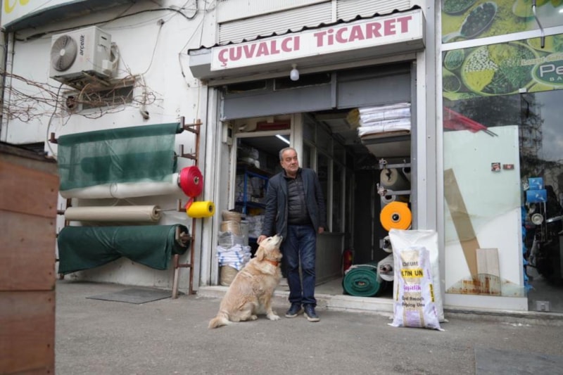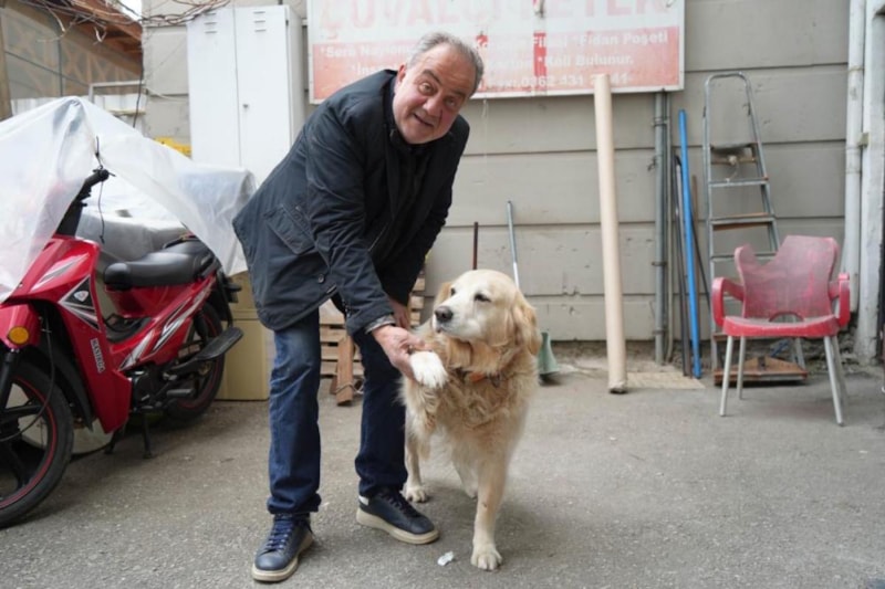 Samsunlu 61 yaşındaki esnaf Bülent Petek, 10 yıl önce dükkanının önünde pitbull saldırısına uğrayan golden cinsi yavru köpeği tedavi ettirip sahiplendi.