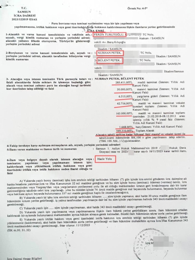 Samsun 1. Asliye Hukuk Mahkemesi, Dr. Ferda Turutoğlu'nun açtığı maddi ve manevi tazminat davasında lehine karar verdi. Mahkeme, davacıyı haklı bularak Petek çiftini 285 bin 441 TL maddi tazminat, 30 bin TL manevi tazminat, 21 bin TL karar-ilam harcı gideri, bin 668 TL harç yargılama gideri, 6 bin 515 TL yargılama gideri, 44 bin 816 TL vekalet ücreti ve 17 bin 900 TL vekalet ücretinin yasal faizleri ile birlikte toplam 465 bin 976 TL para cezasına çarptırdı.