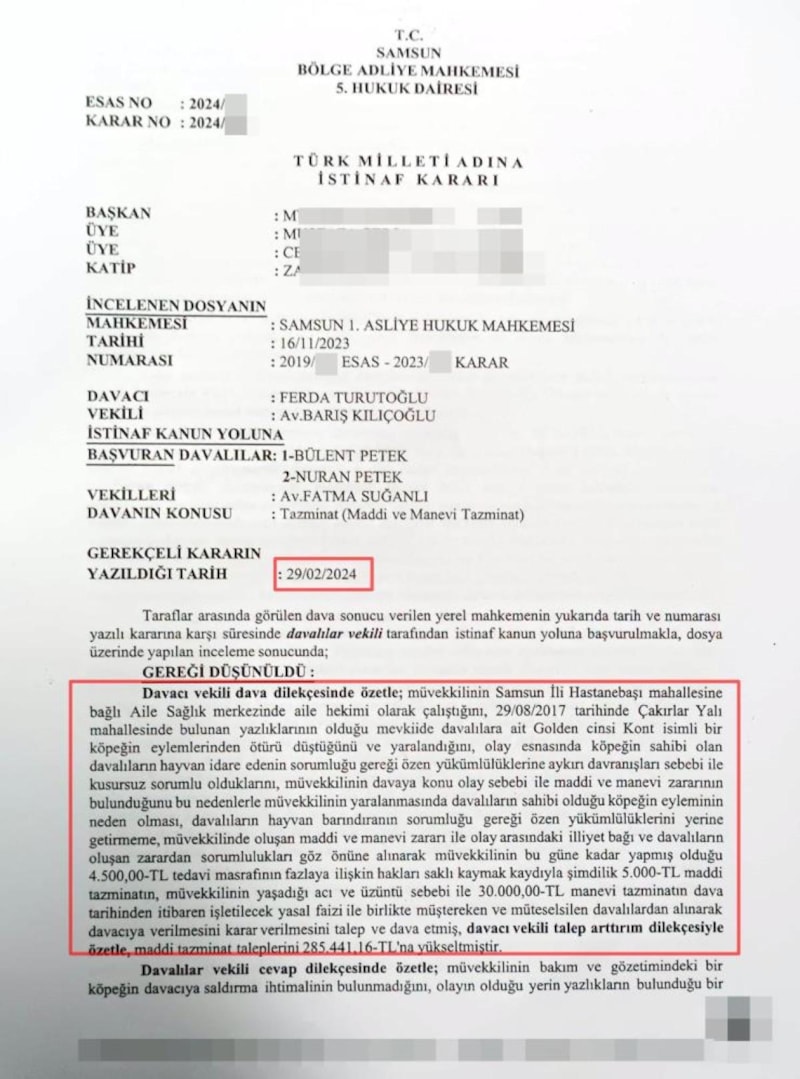 "İstinaf lehimize sonuçlandı. Müvekkilim köpeğin saldırması sonucu duvardan düşüyor. Düşme sonucunda da dizinden ameliyat oluyor. Bacağında platinler var. Bununla ilgili tazminat davası görüldü, lehimize sonuçlandı. Karar, istinaftan da geçerek kesinleşti. Konuyla ilgili yargılama aşaması tamamlandı. Köpek, davalı tarafın köpeği. Bununla alakalı bir inkarları da olmadı. Dava da bu haliyle kesinleşti. Bundan sonra karar kesin olduğu için bir daha dava görülmeyecek. Dosya da icra aşamasında. Doktor Ferda Turutoğlu'nun olayın ardında yüzde 3,4 oranında maluliyeti var. Ayrıca dava karara çıktıktan kısa bir süre sonra davalı taraf üzerine kayıtlı taşınmazı yakın bir tanıdığına devretti. Bununla ilgili de dava açtık. Taşınmaza tedbir uygulandı. Tasarrufun iptali davası da ayrıca devam etmektedir. O davanın da yargılama aşamasının başındayız. Bu olayda 'hayvan idare edenin tazminat sorumluluğu' var. Dava özü itibarıyla hayvan idare edenin tazminat sorumluluğudur. Konunun başka alanlara çekilmesinin manası yok. Başıboş köpeklerle alakalı konularda idarenin sorumluluğu var. Orada kamu hizmeti işlememiş ya da kötü işlemiştir. Orada belediyenin sorumluluğu vardır. Bizim konumuzda ise hayvan sahibinin yasadan doğan sorumluluğu vardır. Bunların birbirine emsal teşkil etmesi konusunda birinde idarenin sorumluğu, diğerinde hayvan sahibinin sorumluluğu var. Özü itibarıyla aynı şeyler olsa da sorumluluk makamları farklıdır."