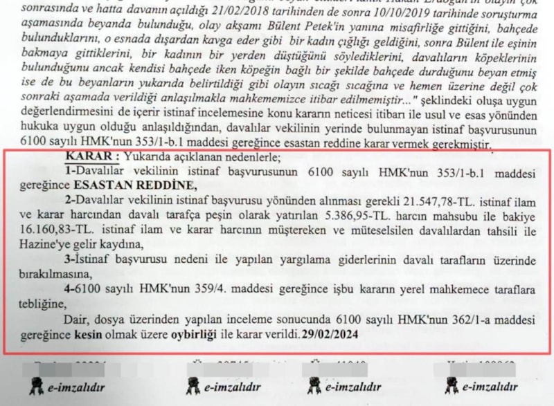 Bölge Adliye Mahkemesi'nin 29 Şubat 2024 tarihinde verdiği kararında "Dosya üzerinde yapılan inceleme sonucunda 6100 sayılı HMK'nın 362/1 maddesi gereğince kesin olmak üzere oy birliği ile karar verildi." denildi.