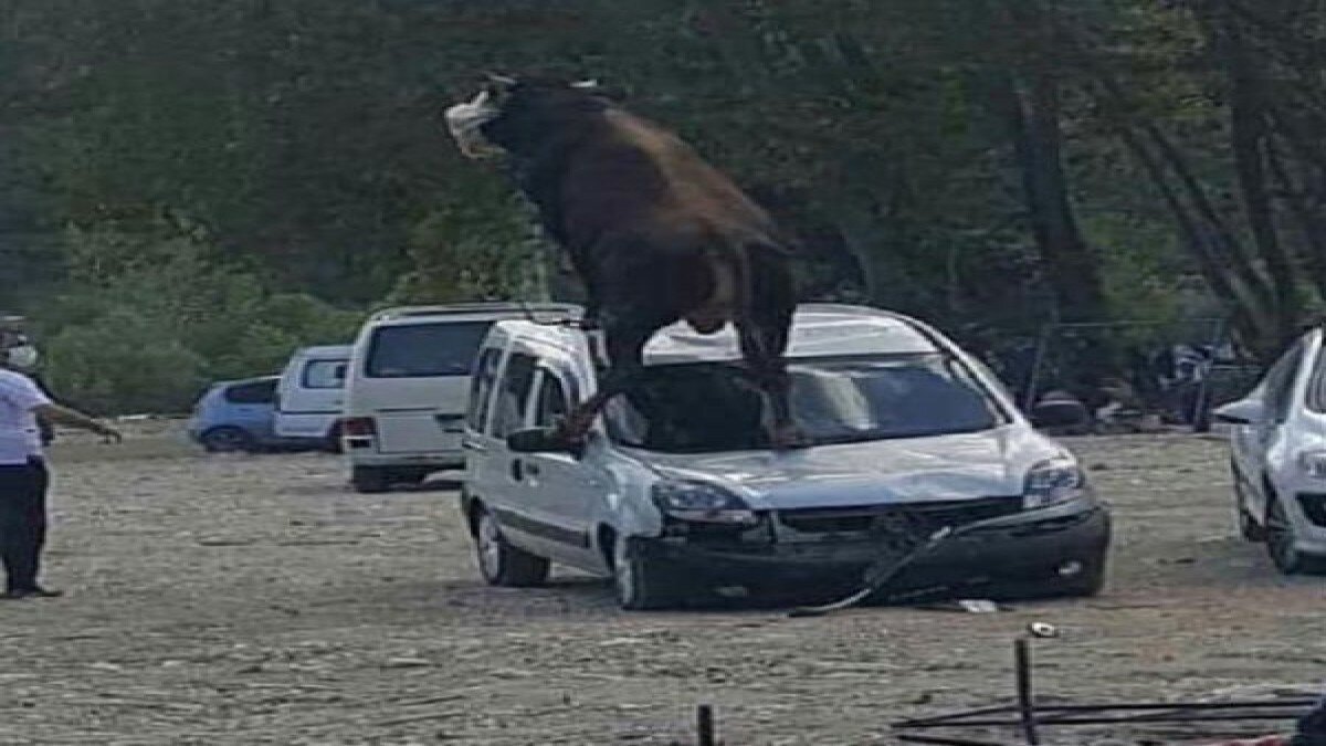 Aracın ön tampon, kaput ve tavan kısmında hasar meydana geldi. Yere düşen boğa güçlükle sakinleştirildi.