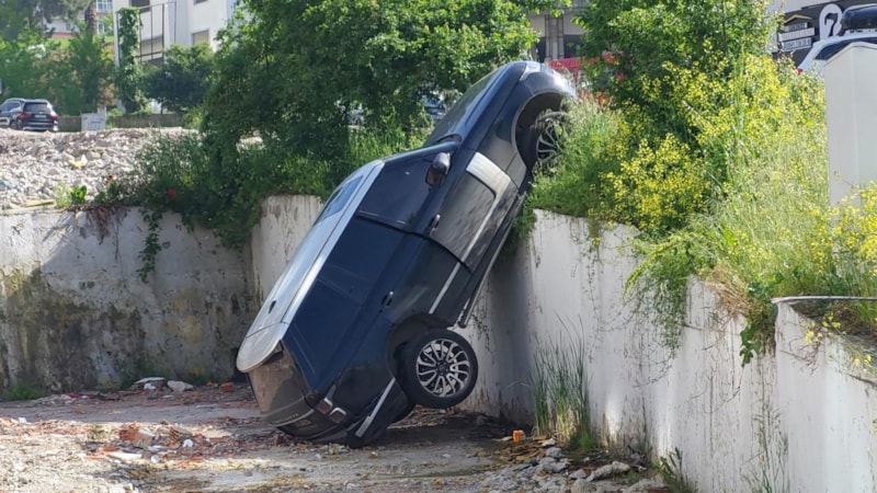 Cip daha sonra yol kenarındaki istinat duvarından aşağı düştü ve duvarda asılı kaldı.