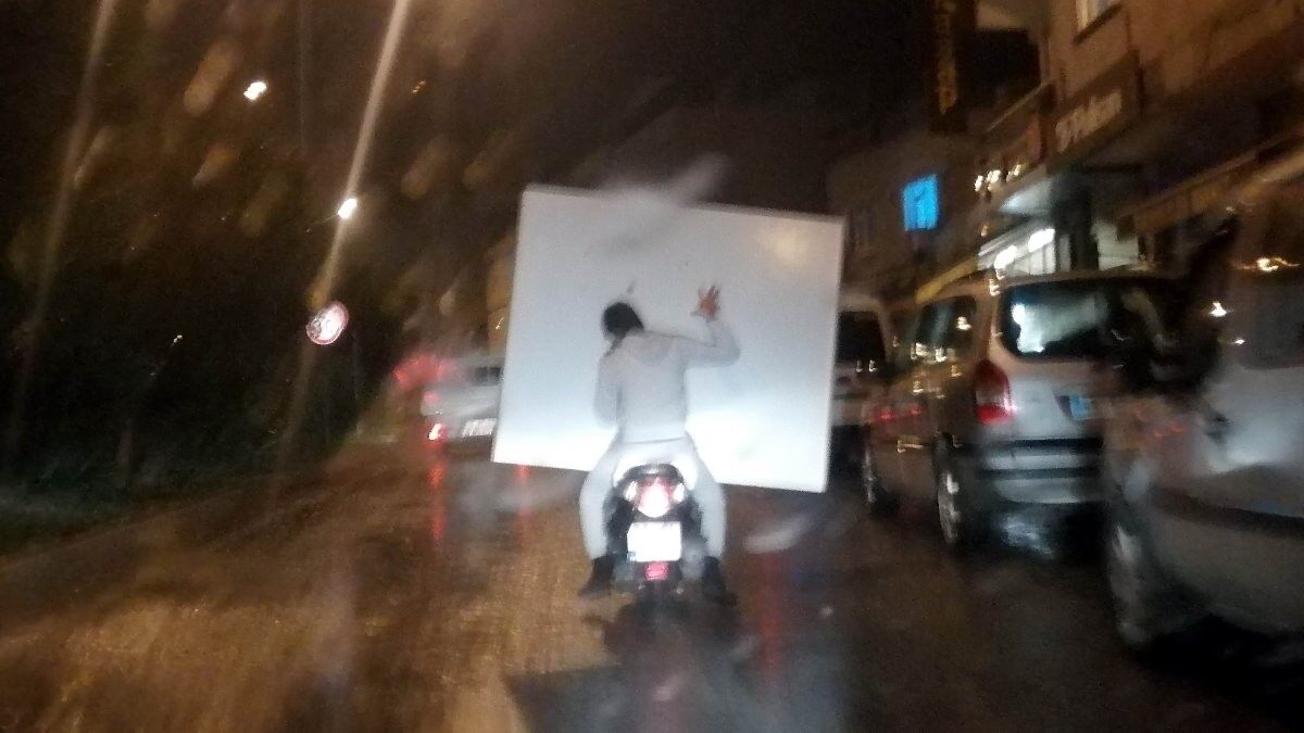 Motosiklet sürücüsü ve arkasındaki yolcu, yağmura aldırmadan aralarına aldıkları tahmini 3 metrekarelik plastik levhayı taşıdı.