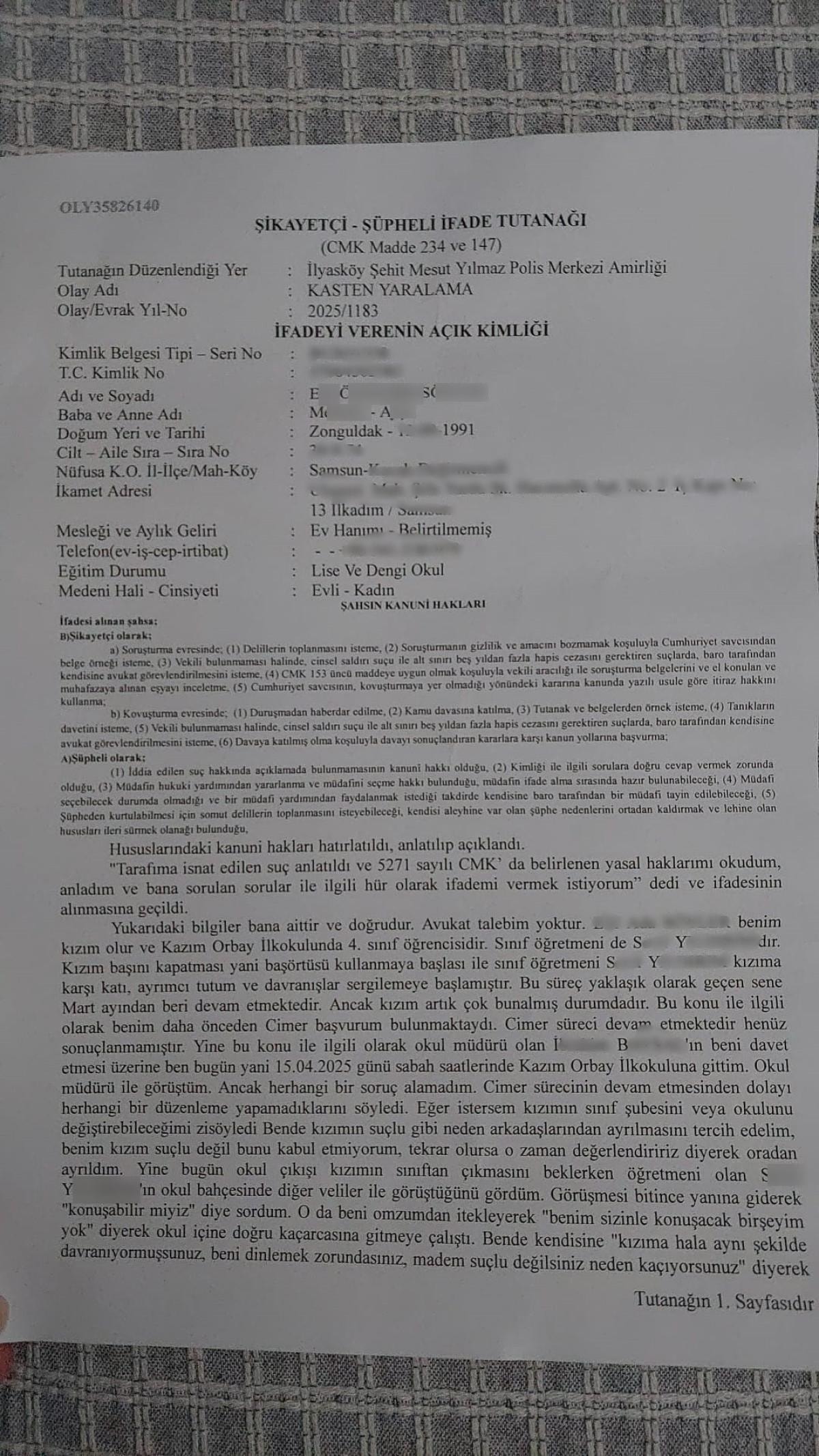 Elif Özdemir Söyler, 28 Ekim 2024 tarihli şikayet dilekçesinde, "Kızım okulda öğrenim süresi içinde kapanmaya karar verdi. Okula başörtülü gittiğinde öğretmeni S.Y., ‘Böyle kafanıza göre kapanamazsınız! Burası Kur'an kursu değil! Şuna bak kadın gibi görünüyorsunuz!' şeklinde ifadeler kullandı. Diğer öğrenciler de bu sözlerden etkilenerek, başörtülü arkadaşlarına ‘kadın gibisin', ‘Suriyeli', ‘Afganlı' gibi söylemlerle alay etmeye başladı." iddiasında bulundu.