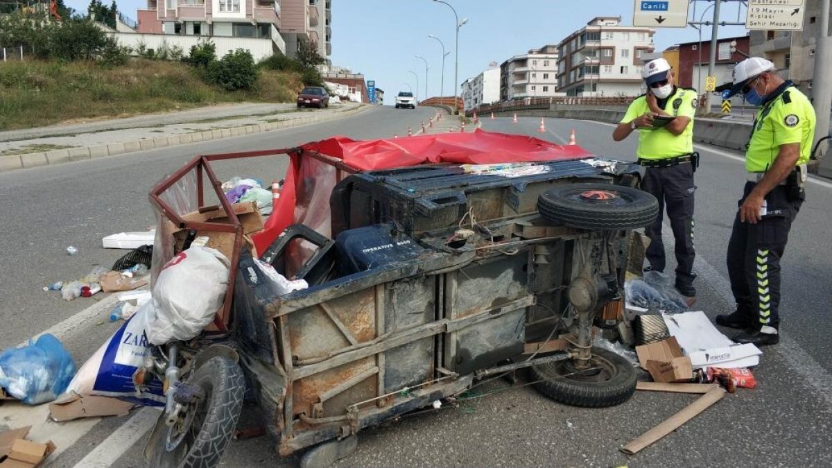 Kazada üç tekerlekli motosiklet devrildi ve üzerinde bulunan katı atıklar yola savruldu.