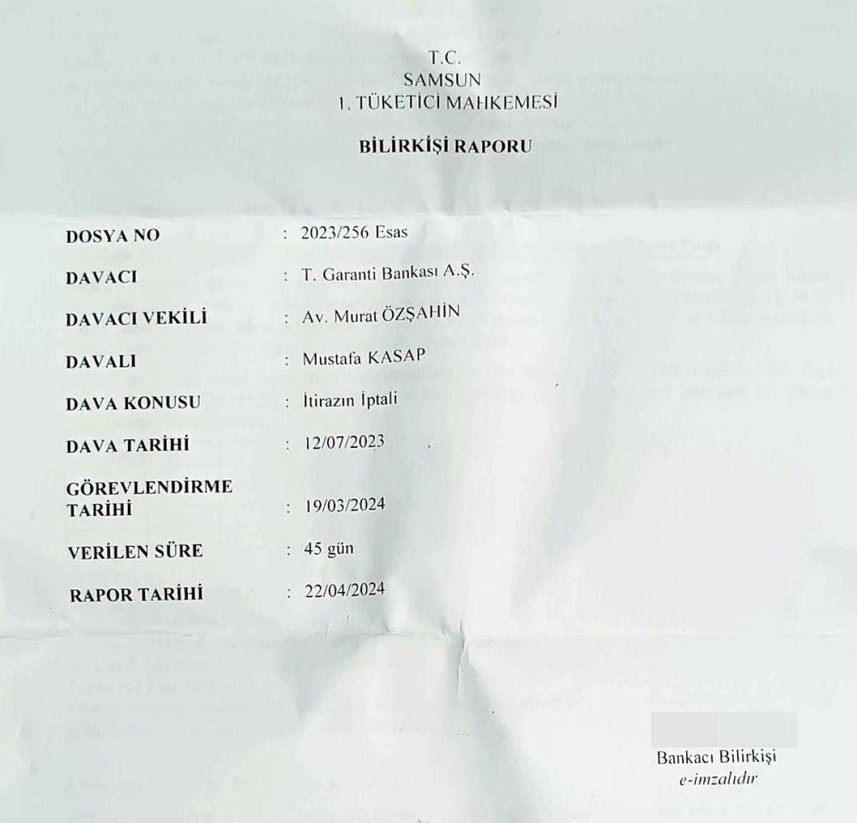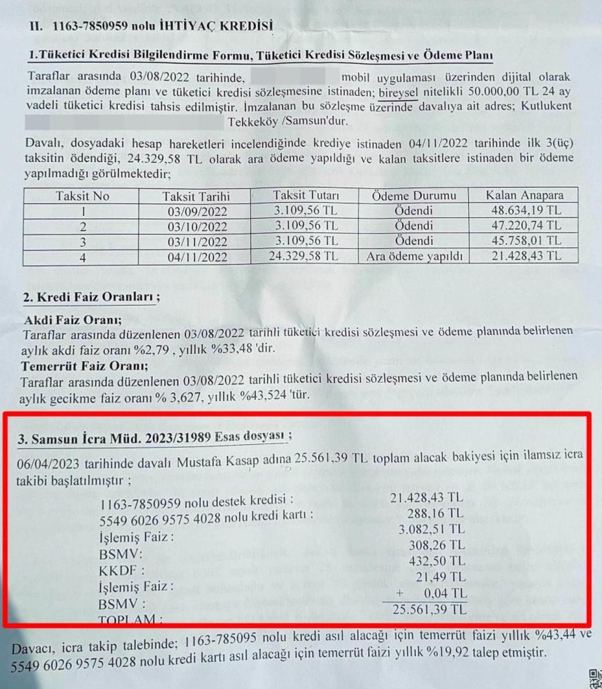 Samsun 1. Tüketici Mahkemesi tarafından bankaya yaptığı itirazı reddedilen Kasap'a bir de Samsun İcra Müdürlüğü tarafından icra takibi başlatıldı.