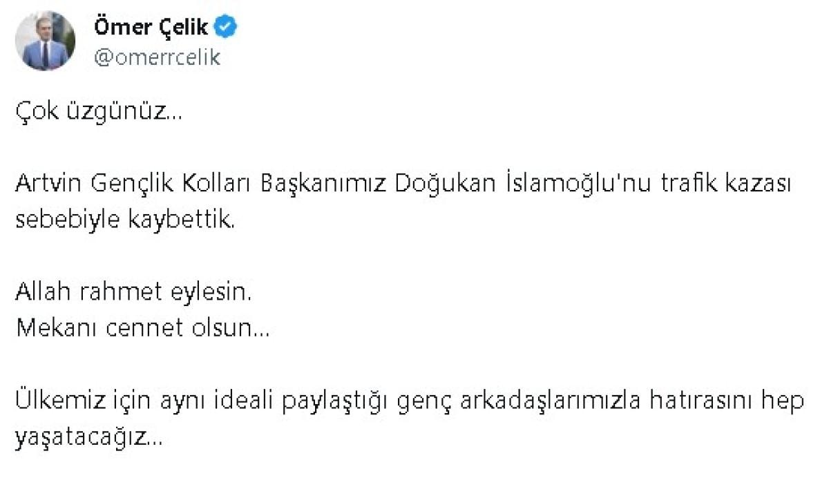 AK Parti Genel Başkan Yardımcısı ve Parti Sözcüsü Ömer Çelik, sosyal medya hesabından paylaştığı taziye mesajında şu ifadelere yer verdi:
