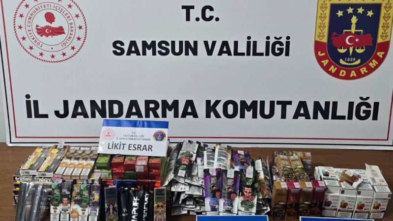 V.M.'nin evinde yapılan aramada; 231 adet elektronik sigara görünümlü likit esrar, 12 adet sentetik ecza hapı, 30 gram skunk maddesi, 1 adet uyuşturucu öğütme aparatı, 1 adet hassas terazi, 1 adet uyuşturucu kullanma aparatı ve bir miktar uyuşturucu madde ele geçirildi.