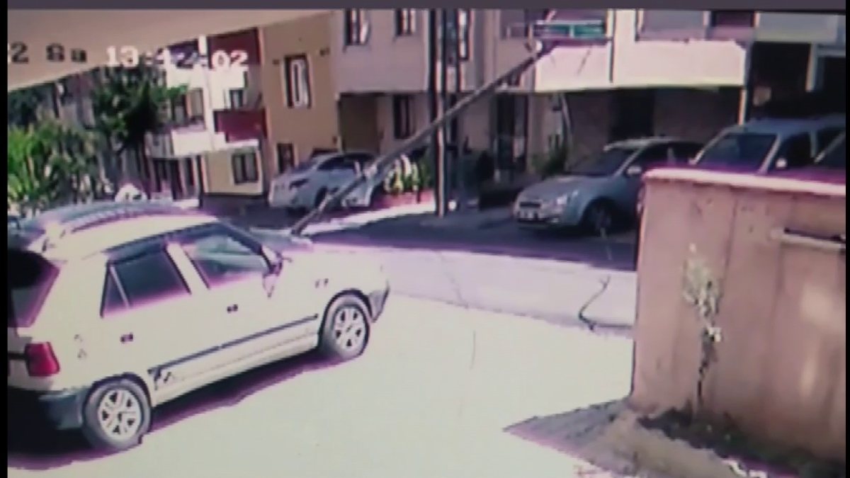 O esnada yolda yürüyen anne ve çocukları, üstlerine doğru düşen elektrik direğinden son anda kurtuldu.