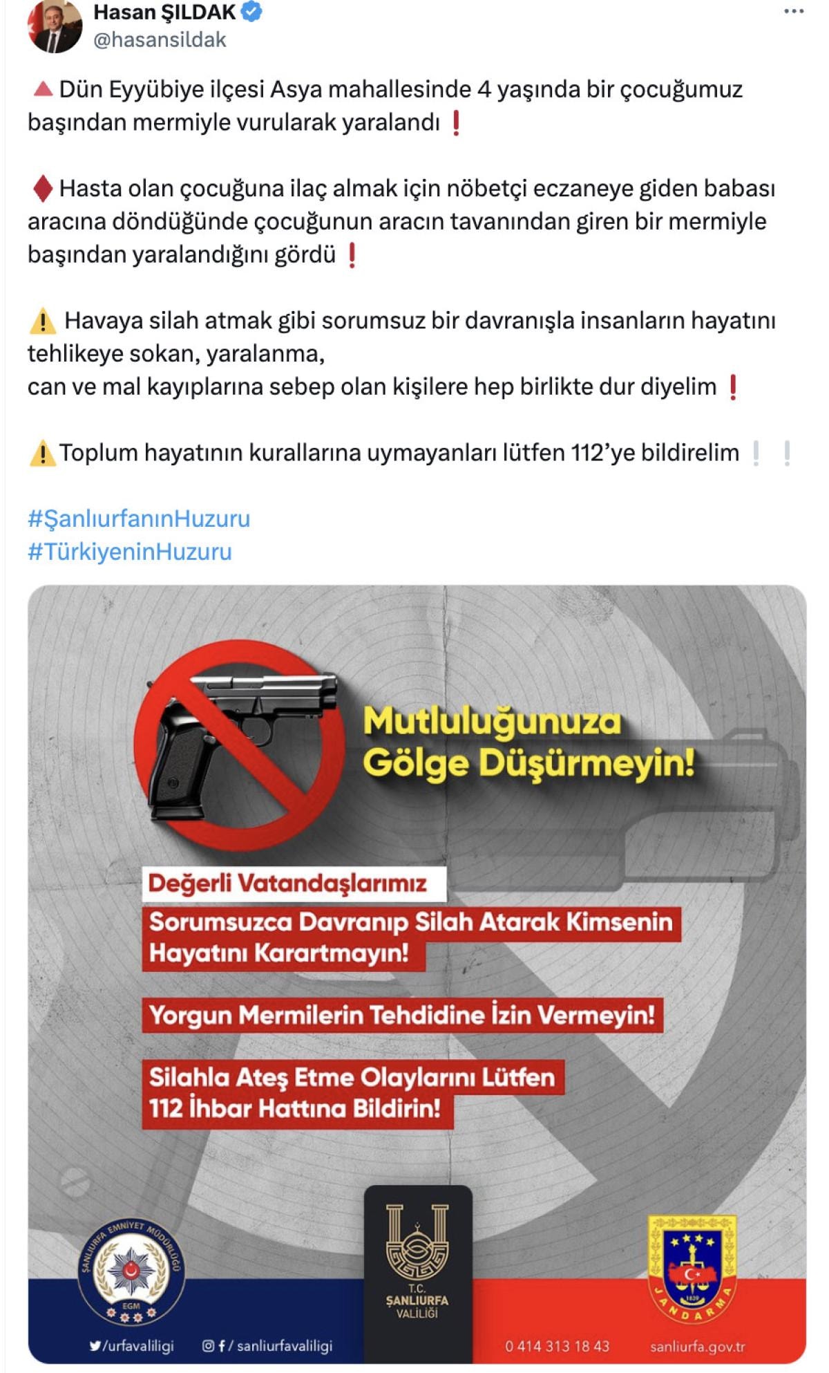 Eyyübiye ilçesi Asya Mahallesi'nde 4 yaşında bir çocuğumuz başından mermiyle vurularak yaralandı. Hasta olan çocuğuna ilaç almak için nöbetçi eczaneye giden babası aracına döndüğünde çocuğunun aracın tavanından giren bir mermiyle başından yaralandığını gördü.