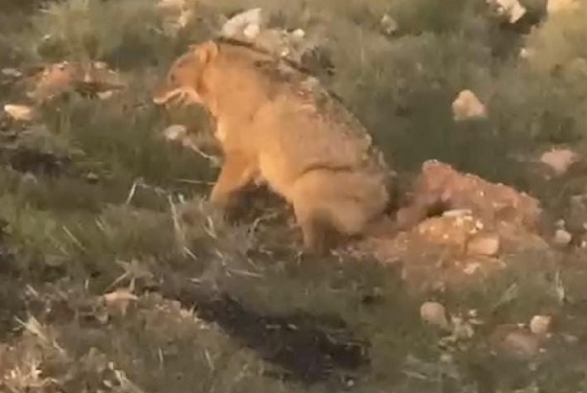 Kırsal mahallede yaşayan bir vatandaş, arka ayakları tutmadığı için acılar içerisinde yerde sürüklenen çakalı taş atarak uzaklaştırmaya çalıştı.