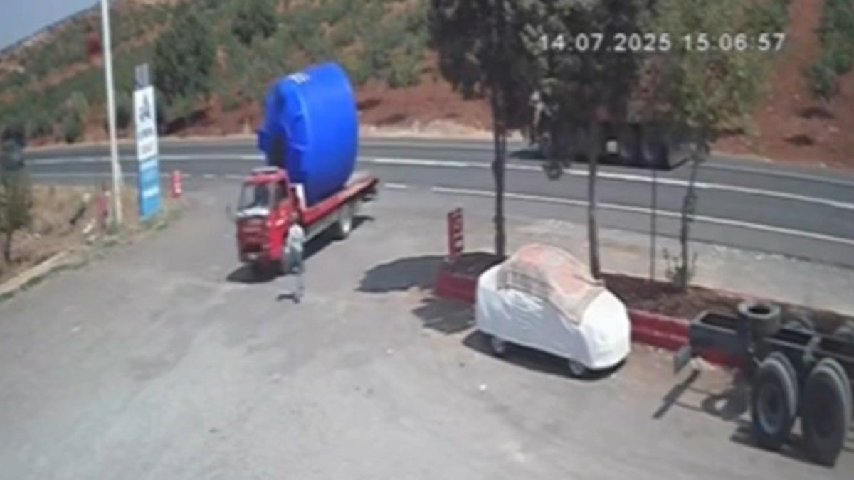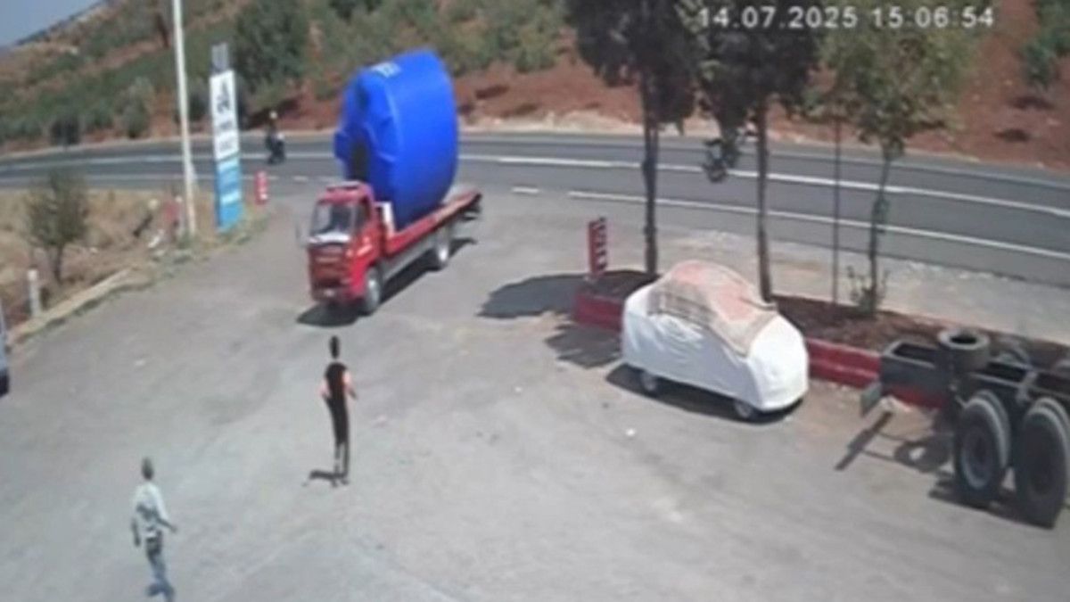 Şanlıurfa'da Gaziantep kara yolunda yakıt almak için istasyona giren çekici sürücüsü aracını park ettikten sonra el frenini çekmeyi unutarak içeriye girdi.
