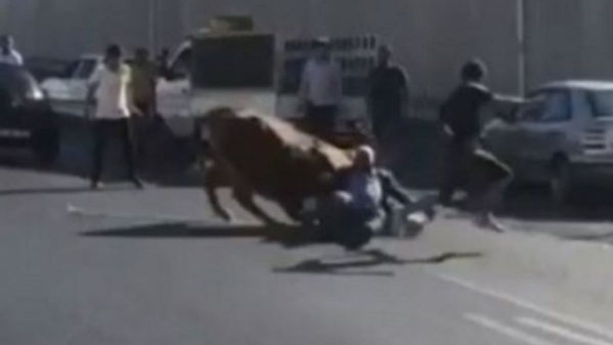 Yol ortasında kaçan boğa sürücülere zor anlar yaşatırken onu yakalamaya çalışan yaşlı sahibini ise yere serdi. Yaşlı adam boğanın boynuz darbeleri ile yaralandı.