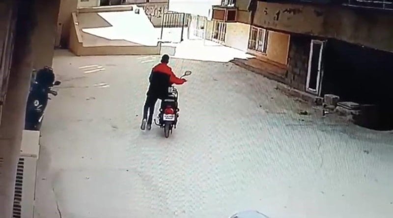 Şüpheli şahıs, o anları kaydeden güvenlik kamerasına aldırış etmeden bindiği elektrikli bisikletle kayıplara karıştı.