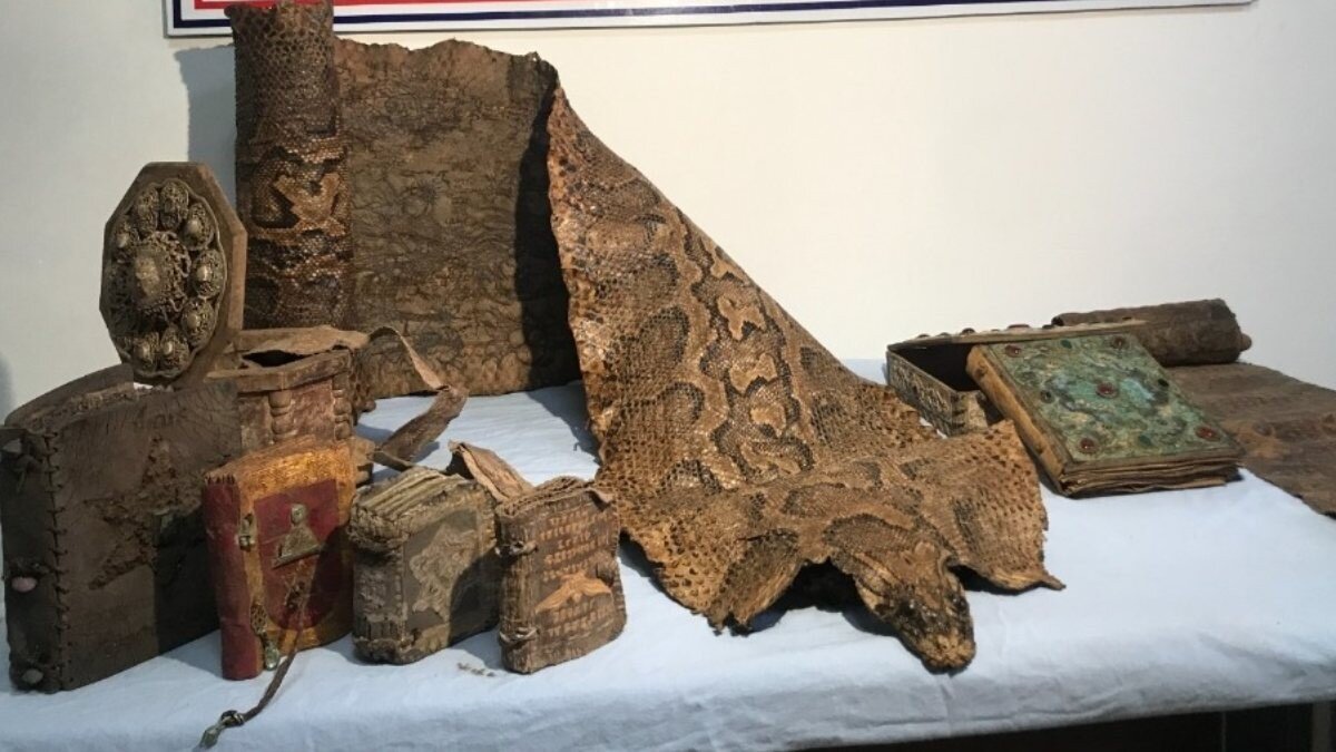 Ortaçağ’dan kaldığı değerlendirilen 5 dini kitap, iki deri üzerine el yazması dini yazıt, iki kitap kutusu ve dini yazıların bulunduğu parşömen ele geçirildi.