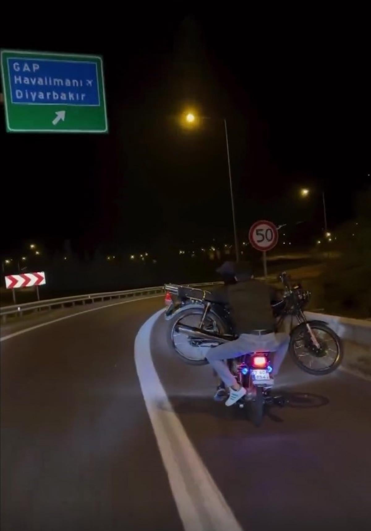 07 BDA 754 plakalı motosiklette yolculuk eden 2 kişi, motosikletin üzerine başka bir motosiklet yükleyerek trafikte ilerledi.
