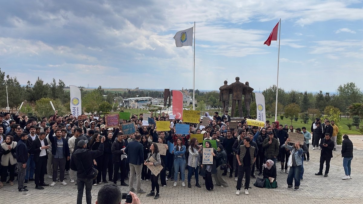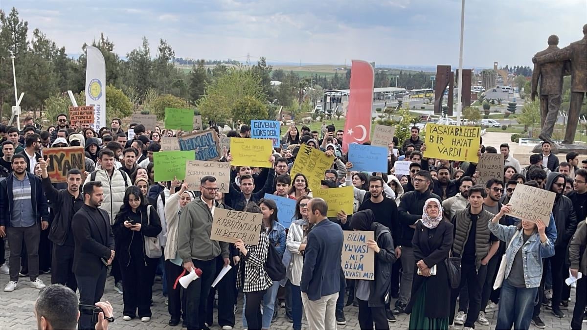 Rektör aleyhine slogan atan öğrenciler, kampüs içerisinde eczane bulunmadığını, kampüse en yakın eczaneye giden yolda üst geçit olmadığını dile getirdi.