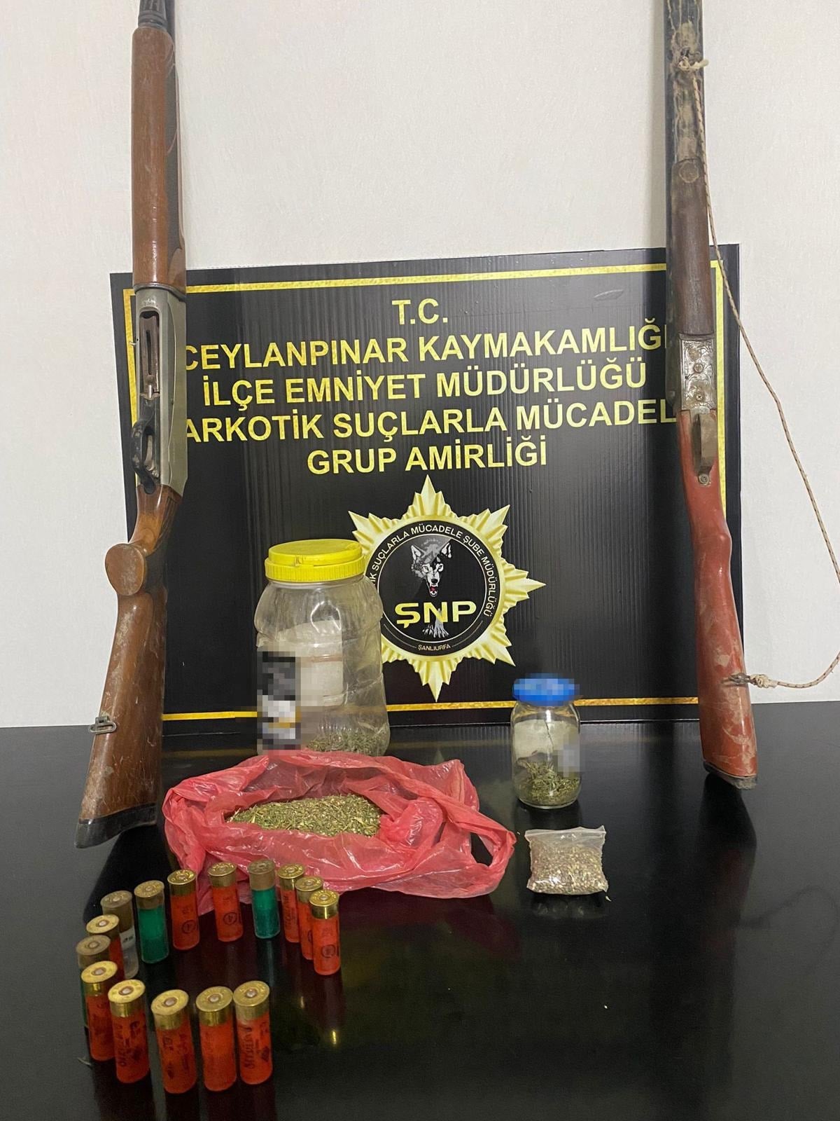 Yapılan aramada; 2 parça halinde 266 gram kenevir tohumu, 2 parça halinde 382 gram esrar, 2 adet ruhsatsız av tüfeği ve 15 adet tüfeklere ait mermiler ele geçirildi.