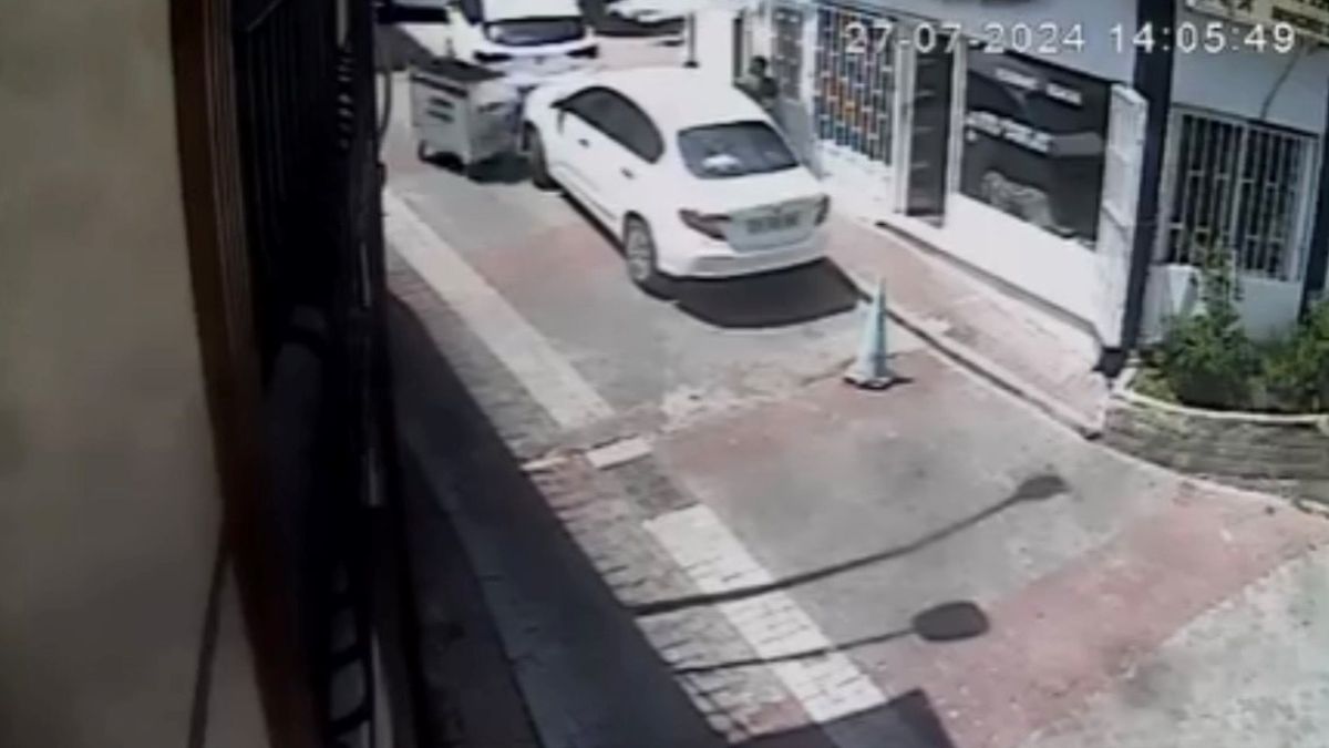 Görüntülerde, konteynerin araçlara çarparak yokuştan kaydığı, bir kişinin de yakalamaya çalıştığı görülüyor.