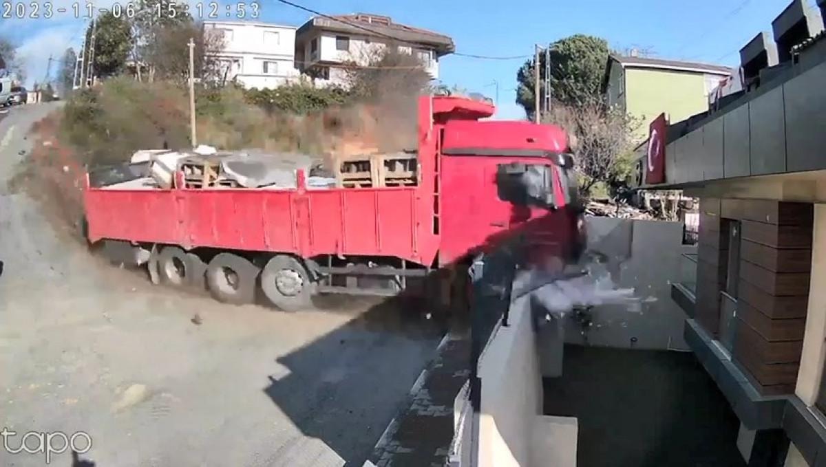 Son anda duran bir otomobil ile güvenlik kulübesini de teğet geçen tır, bir binanın bahçe duvarına çarparak durabildi.